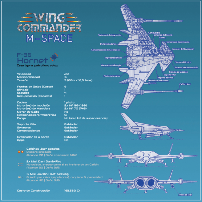 El “Caza estelar: Equilibrado” de la página 182 de M-Space tiene 8 Módulos. En la versión en inglés de M-Space, esta astronave atiende al nombre de “X Fighter”. ¿Caprichos de traducción? En ambos idiomas, la descripción y configuración de la astronave podrían sugerir un familiar inesperado del Ala-X. Admito que mejor evitar malos entendidos con cierta poderosa franquicia espacial. Volviendo al asunto, por proximidad de Tamaño nuestro Hornet debería rondar los 8-10 Módulos, no más.