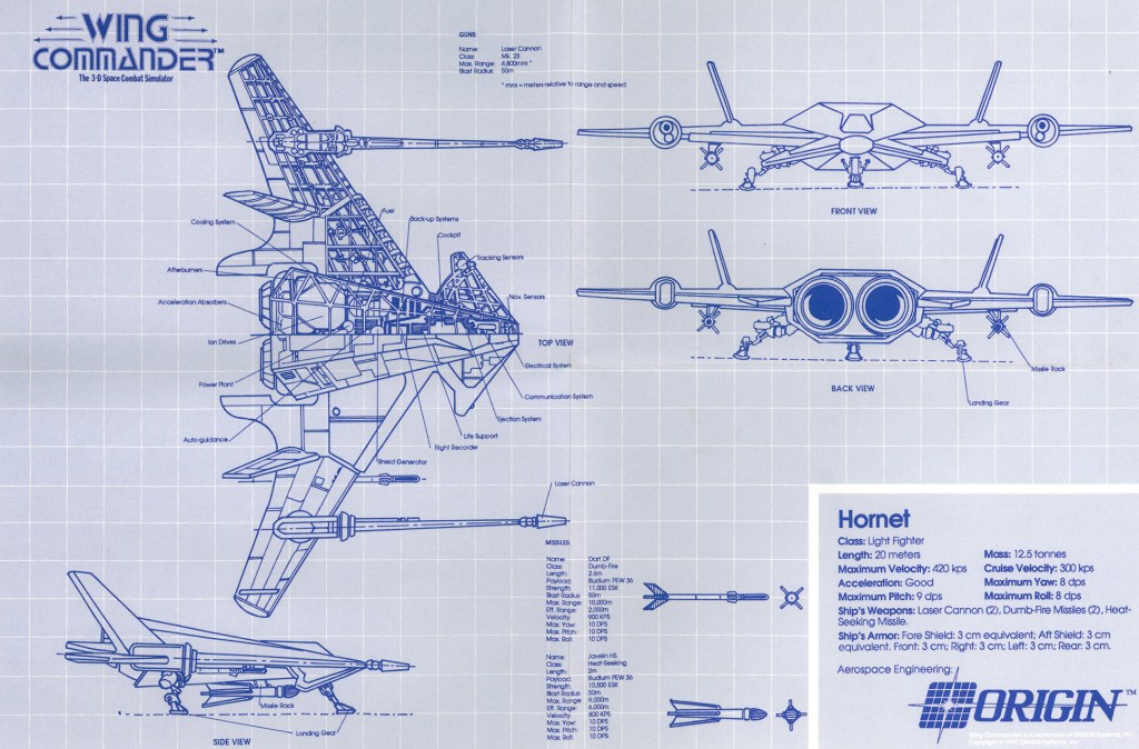 Puestos a construir el Hornet, tenemos la buena fortuna de contar con el plano del diseño original, descargable desde la zona dedicada al F-36 Hornet de la Enciclopedia referenciada arriba. En el primer título de Wing Commander podías pilotar 4 tipos de cazas diferentes: Hornet, Scimitar, Raptor y Rapier. La caja del juego traía los planos detallados en gran tamaño de las 4 naves. Aquí los tenéis agrupados para descarga. ¡Tremendo subidón!