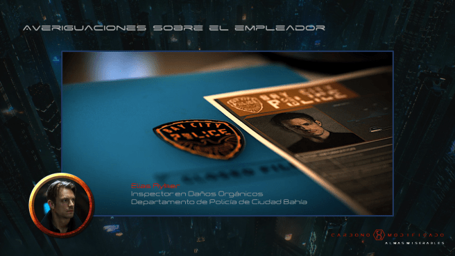 Introducir a Elias Ryker, inspector de Daños Orgánicos del Departamento de Policía de Ciudad Bahía, es un tributo como gran fan de esta trilogía de Richard Morgan. Un hilo de conexión con la obra que admiro. He leído innumerables veces el primero de los libros, Carbono Modificado, para escribir esta aventura y moldear las motivaciones y comportamientos de Elias Ryker, manteniéndome fiel a lo que conocemos de él desde el futuro.